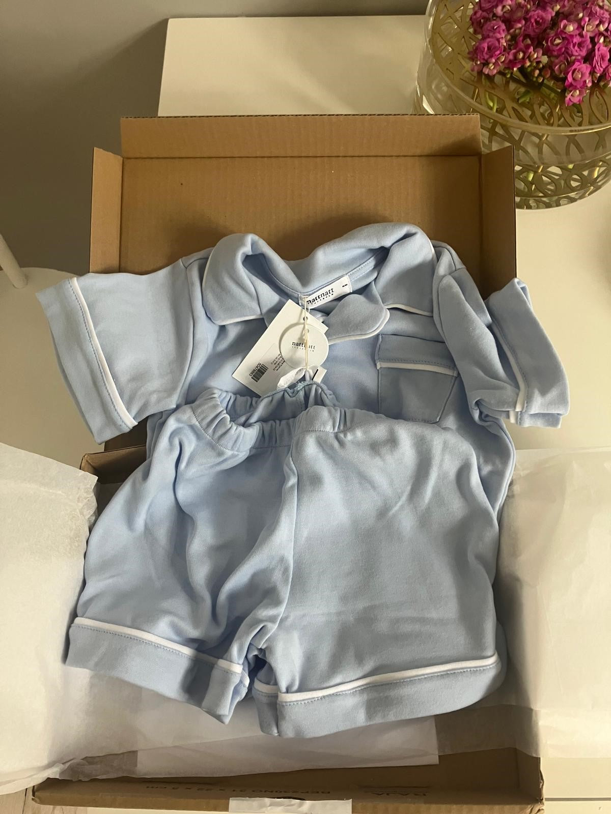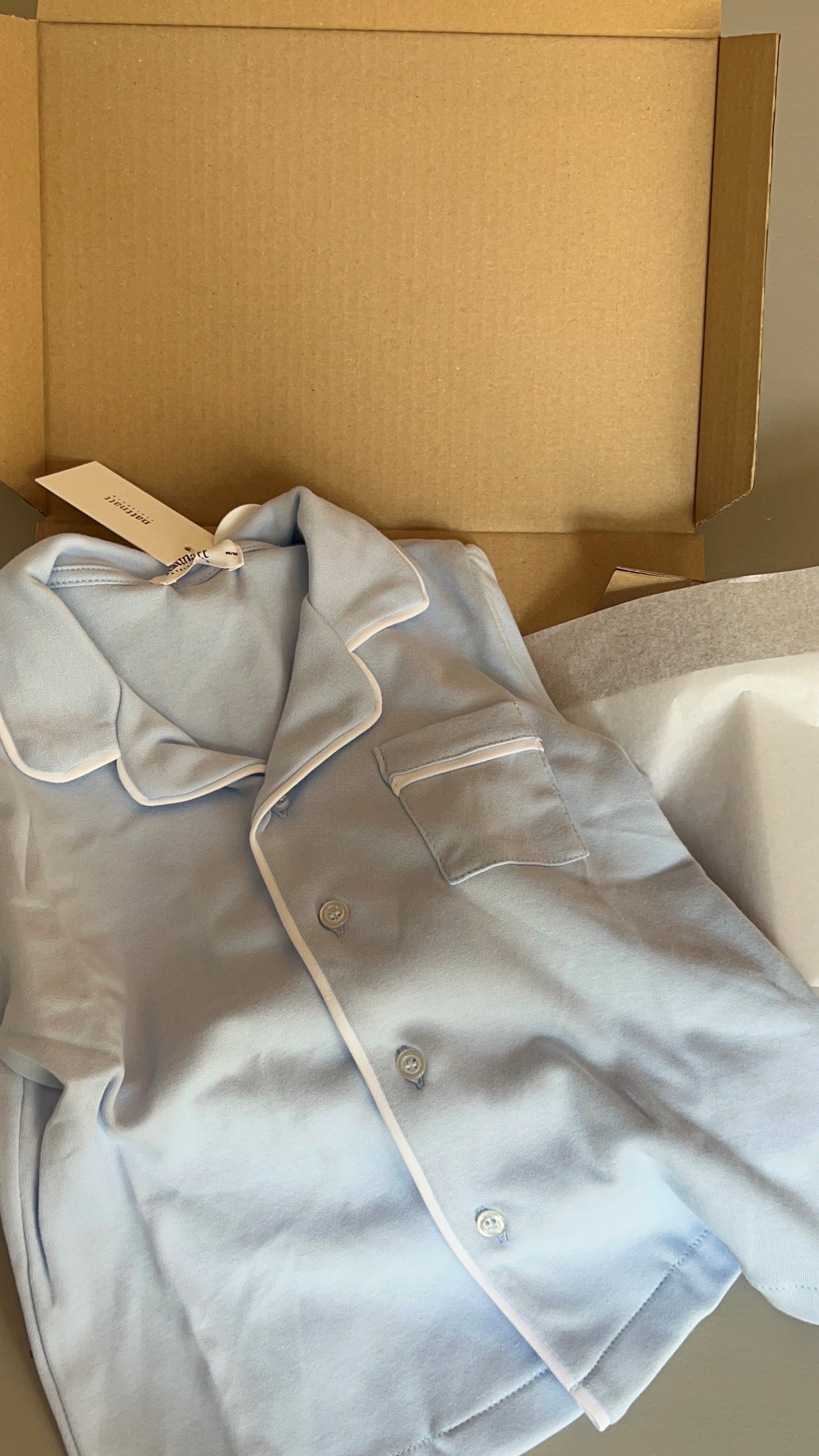 Kortärmad pyjamas blå med vita detaljer. Tillverkad i 100% ekologisk bomull i ett otroligt mjukt tyg som är lent mot huden. Tidlös och klassisk design som passar både pojke och flicka. Överdelen har en klassisk krage med knappar och byxorna har resår i midjan.
