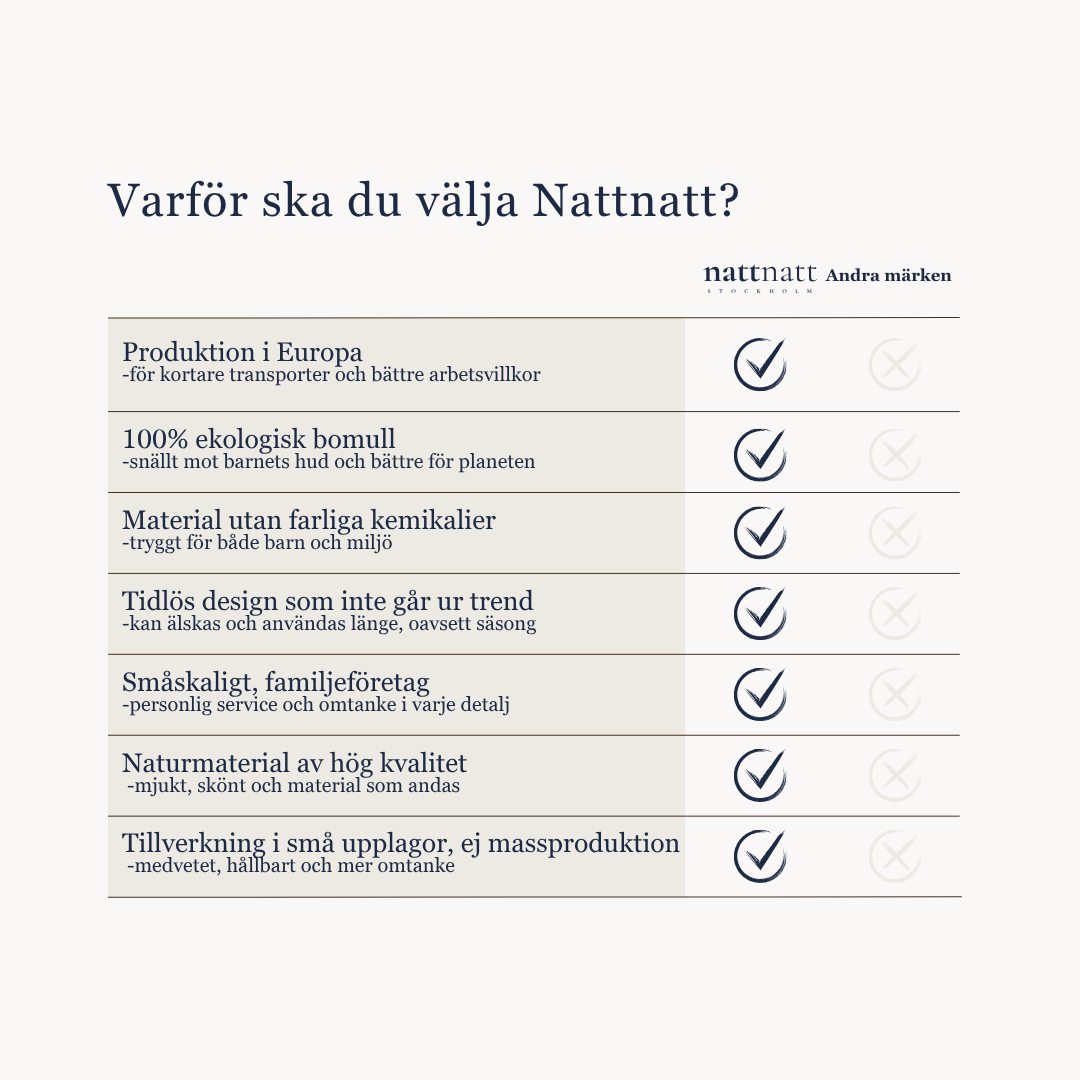 Vi vill att våra plagg ska kännas trygga, mjuka och meningsfulla. Något du kan klä ditt barn i med gott samvete. För de där små nattnattstunderna som förtjänar det allra bästa.
