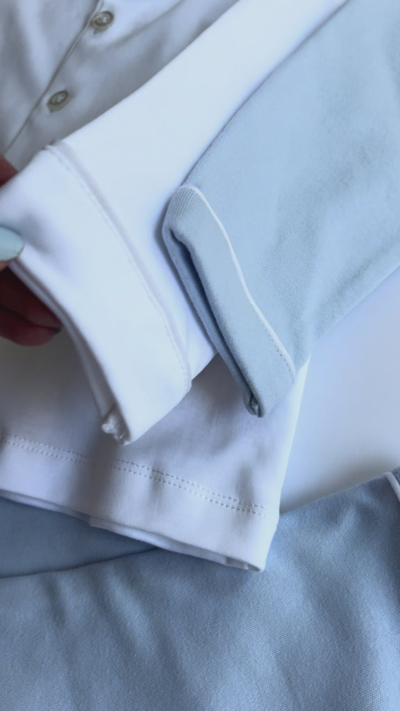 Pyjamas med lång ärm i en härlig ljusblå färg med vita detaljer. Tyget består av 100% ekologisk bomull och är otroligt mjukt mot huden. Andas väl och gjord för att vara bekväm att sova och leka i. Tidlös och klassisk design som passar både pojke och flicka. Överdelen har en klassisk krage med knappar och byxorna har resår i midjan. Finns i fler färger här.